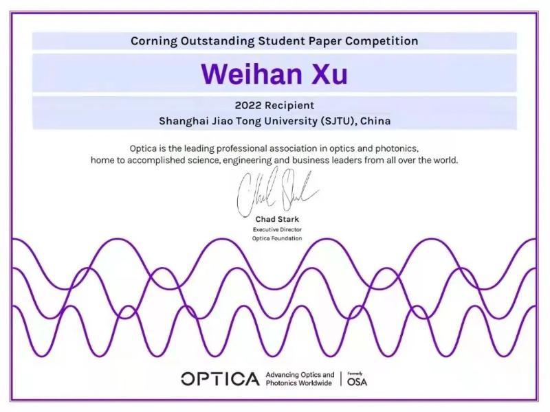 2022年光纤通讯大会共接收600余篇会议论文,许维翰的论文基于新兴的硅-氮化硅多层集成平台,设计实现了芯片级固态激光雷达发射机,其研究结果实验积累了重要的技术储备与工程经验。经过同行评审、口头报告、答辩等评比环节,最终摘得全球唯一的大奖(Grand Prize)。