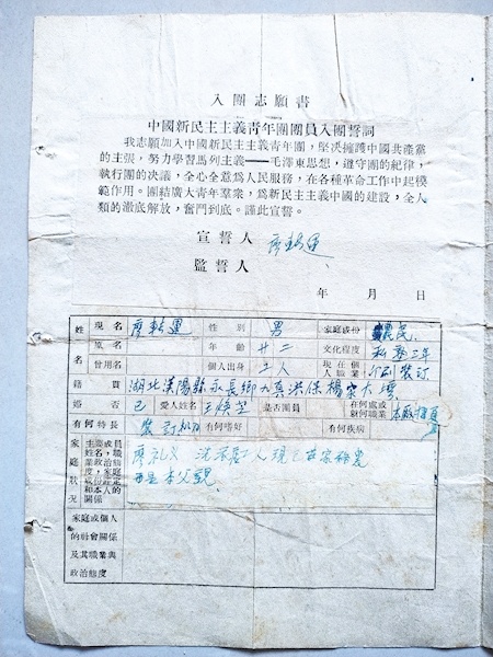 武汉解放后第一批《入团志愿书》。 (受访者供图)