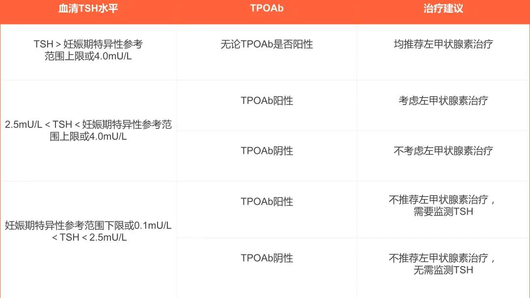 根据《妊娠和产后甲状腺疾病诊治指南》推荐,妊娠期TSH水平和TPOAb是否阳性对用药与否具有特殊性的,通过下面这个表就可以一目了然。