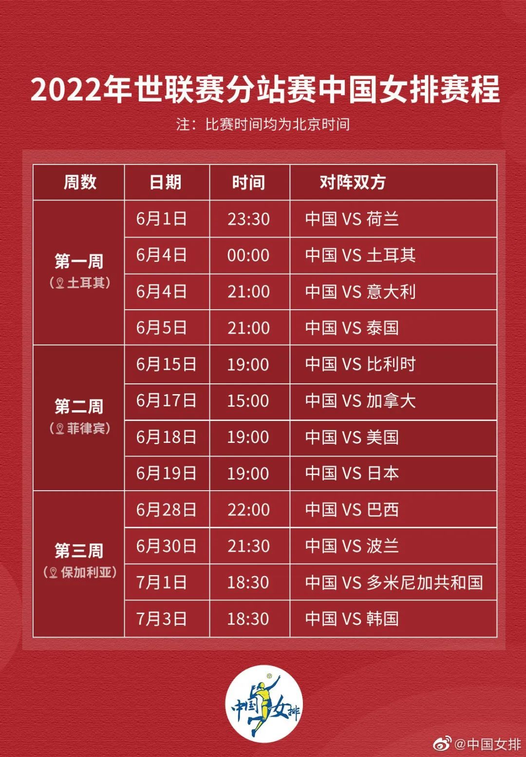 根据赛程,中国女排将在