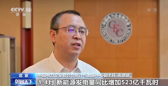 中国电力企业联合会统计与数据中心副主任 蒋德斌:1—4月,新能源发电量同比增加523亿千瓦时,这个增量是1—4月全社会用电量同比增量的58.6%