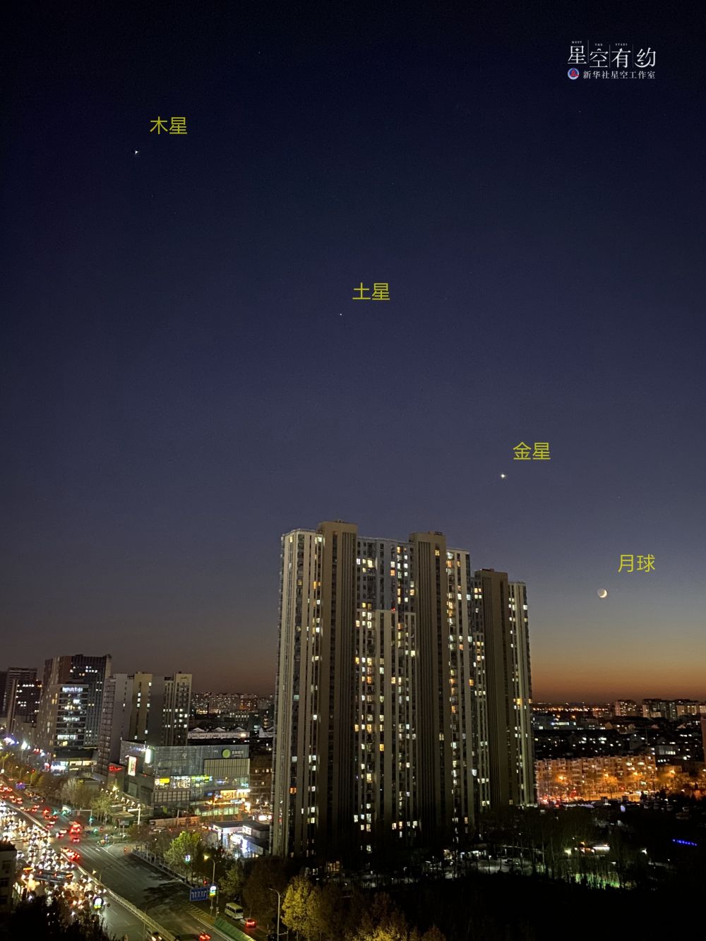 这是北京市天文爱好者史凌2021年12月6日在北京大兴拍摄的“木土金月连珠”。(本人供图)