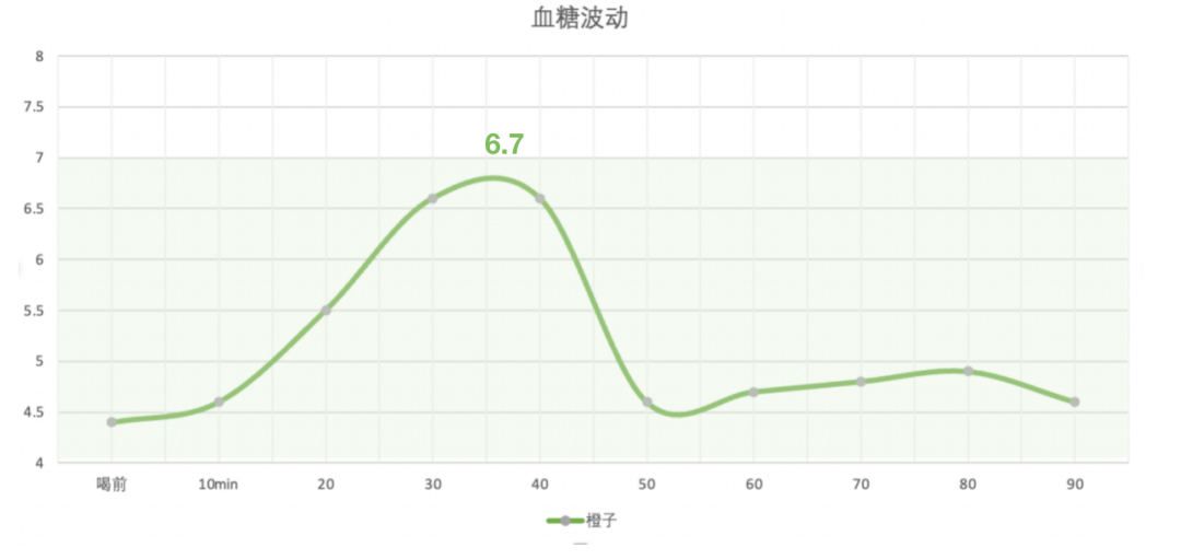快乐的第一天清晨,两颗手剥橙子(340 克)下肚后,工具人的血糖经历了一个小幅度的波动,最高峰(35 分钟)时增加了 2.2(从 4.4 ➡️ 6.7) 。