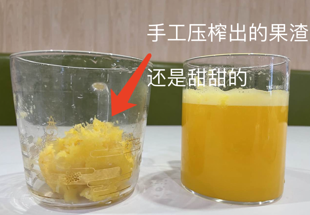 虽然已经很努力了,但 340 克的橙子肉,还是剩下了 86 克的果渣