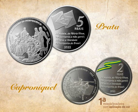 为纪念巴西独立200周年,巴西中央银行7月26日发行面值分别为2雷亚尔(约合2.53元人民币)和5雷亚尔(约合6.32元人民币)的特种纪念币。