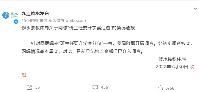 主任500、科任老师300,如果是老师开车去的话,一般是补200元或100元的油费……江西修水县一名学生爆料称,有人以班长口吻在班级群里发布群公告,建议各位同学在升学宴上给老师包红包。如此明目张胆索要红包,令人惊诧。针对此事,当地教体局进行了调查核实,确认情况基本属实,目前县纪检监察部门已经介入调查。