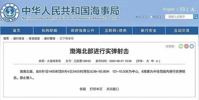 渤海北部,自8月1日1400时至8月4日2400时将在以39-50.80N 121-10.03E为中心,8海里为半径范围内进行实弹射击。禁止驶入。