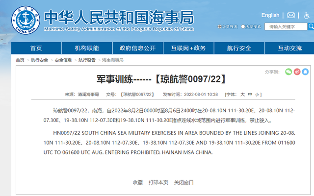 琼航警0097/22,南海,自2022年8月2日0000时至8月6日2400时在20-08.10N 111-30.20E、20-08.10N 112-07.30E、19-38.10N 112-07.30E和19-38.10N 111-30.20E诸点连线水域范围内进行军事训练,禁止驶入。