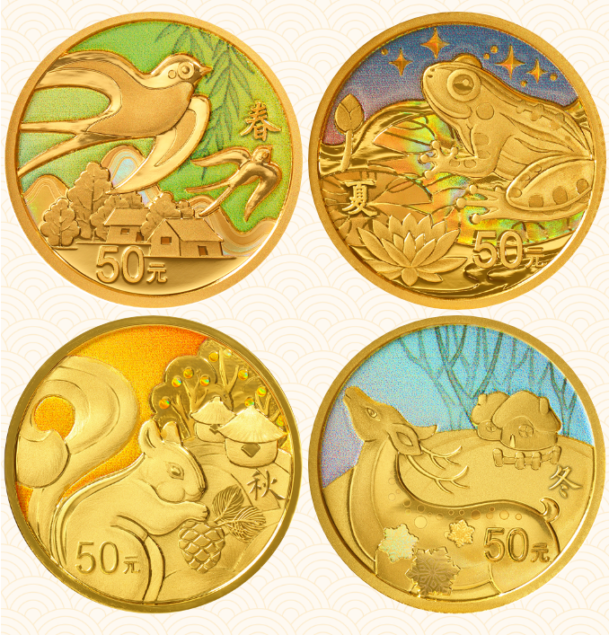 3克圆形金质纪念币背面图案为装饰燕子造型,衬以柳枝、民居、树木、山峦等组合设计,并刊“春”字样及面额。