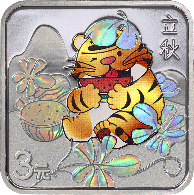 8克正方形银质纪念币背面图案以虎、西瓜、瓜秧为主要设计元素,展现立秋时节吃瓜“咬秋”习俗,并刊“立秋”字样及面额。