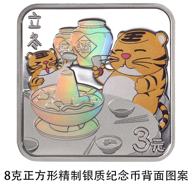 8克正方形银质纪念币背面图案以虎、火锅、酒坛为主要设计元素,展现立冬时节“冬酿”“补冬”习俗,并刊“立冬”字样及面额。