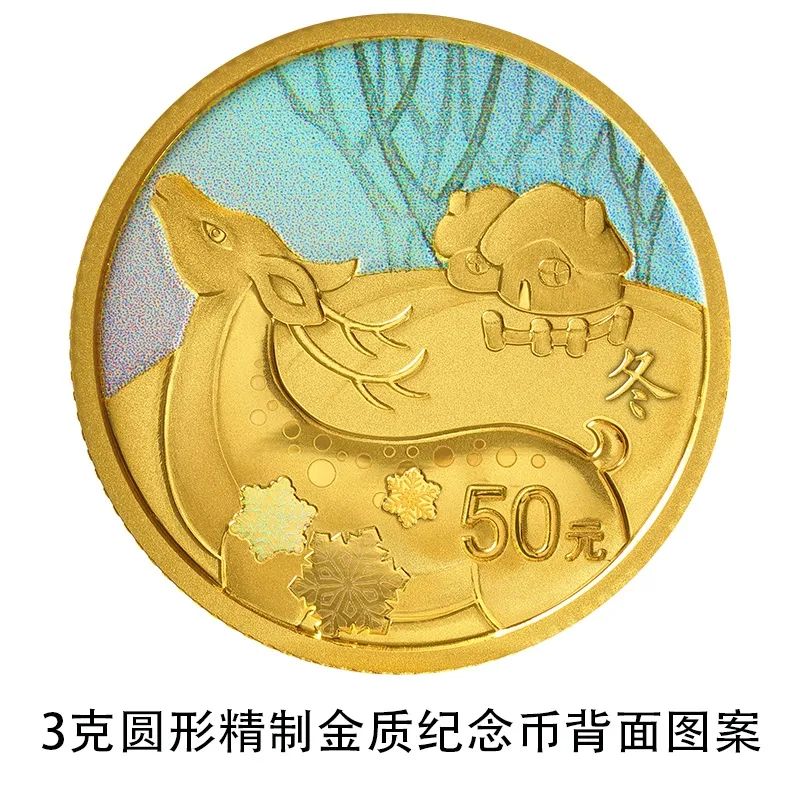 3克圆形金质纪念币背面图案为装饰鹿造型,衬以雪花、民居、树林等组合设计,并刊“冬”字样及面额。