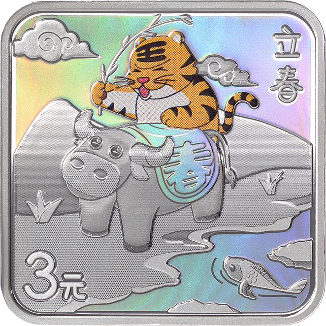 8克正方形银质纪念币背面图案以虎、春牛、鱼为主要设计元素,展现立春时节“鱼陟负冰”物候现象、“打春牛”习俗,并刊“立春”字样及面额。