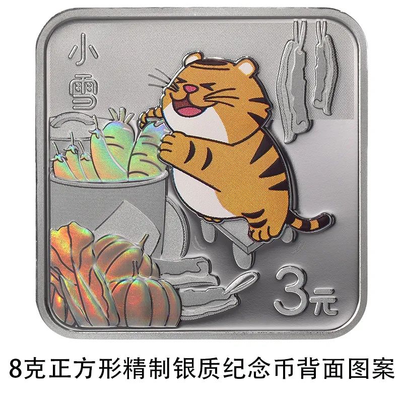 8克正方形银质纪念币背面图案以虎、蔬菜、腊肉为主要设计元素,展现小雪时节“腌菜”“制腊肉”习俗,并刊“小雪”字样及面额。