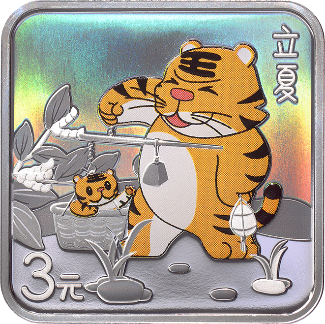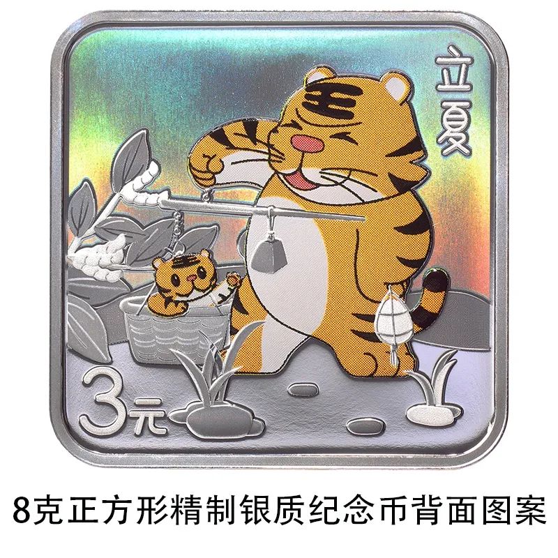 8克正方形银质纪念币背面图案以虎、杆秤、蛋、蚕豆为主要设计元素,展现立夏时节“立夏称人”“立夏挂蛋”习俗,并刊“立夏”字样及面额。