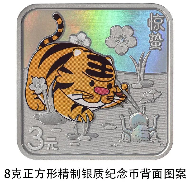 8克正方形银质纪念币背面图案以虎、蛰虫、桃花为主要设计元素,展现惊蛰时节“春雷惊百虫”物候现象,并刊“惊蛰”字样及面额。