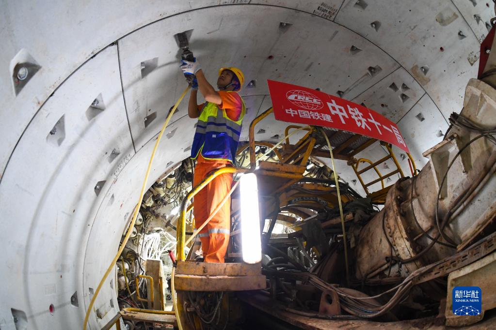 8月2日,建设者在广州地铁十号线东湖站至滨江东路站区间安装管片螺栓。