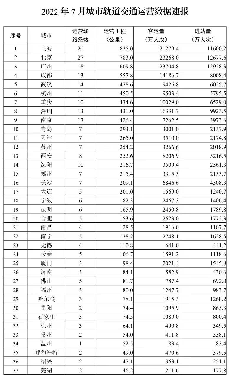 按照疫情防控要求,昆山、天水暂停全线网轨道交通运营服务,上海、成都、武汉、深圳、南京、天津、无锡、温州等城市暂停部分车站运营服务。截至7月底,昆山、天水已恢复运营。