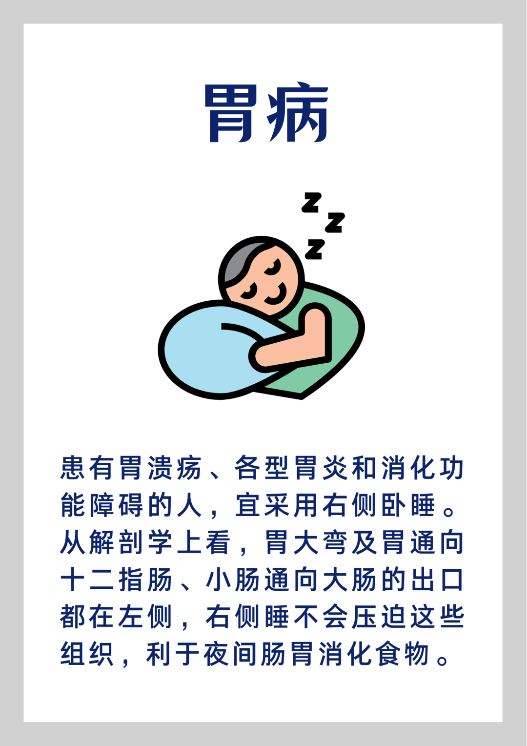 右侧卧的睡姿有助于减少胃食管反流,利于食物消化,可减轻某些胃病及胃食管反流患者反酸、烧心的症状。