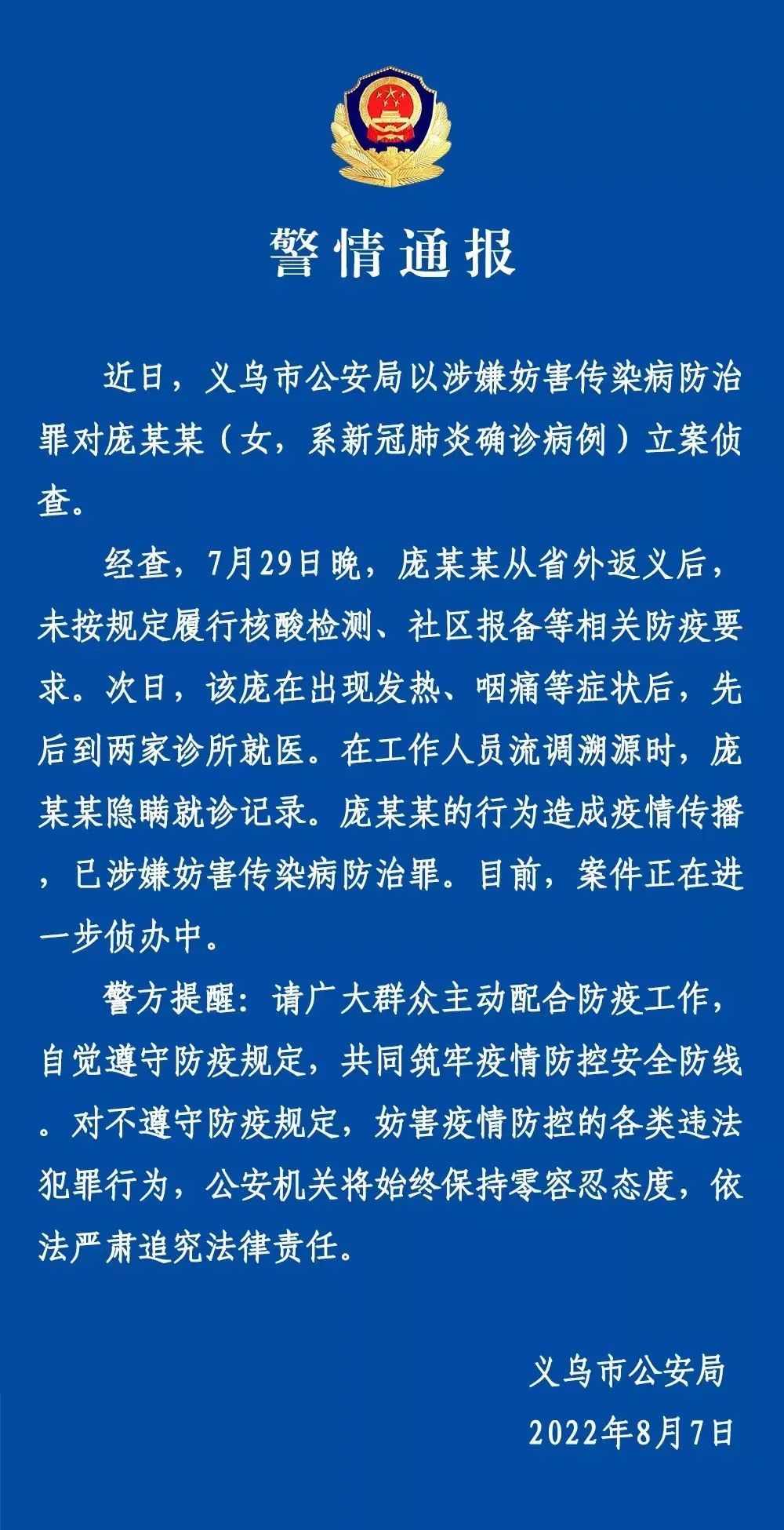 近日,义乌市公安局以涉嫌妨害传染病防治罪对庞某某(女,系新冠肺炎确诊病例)立案侦查。