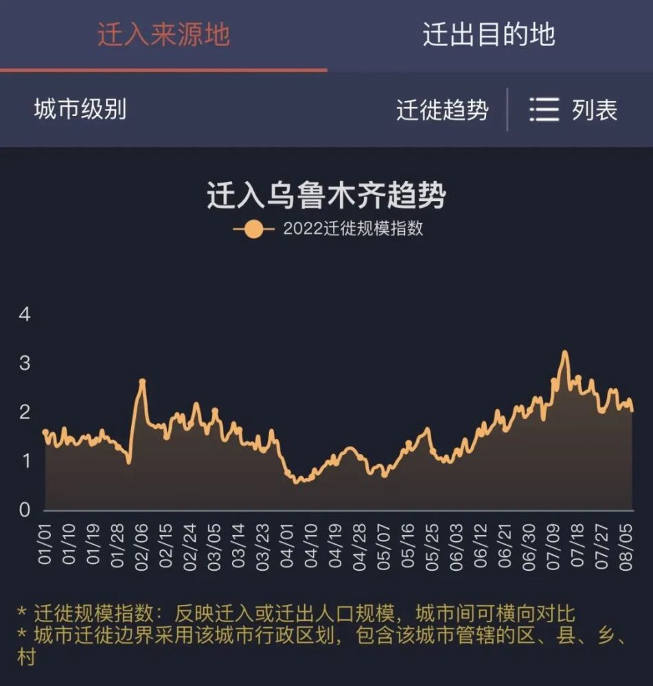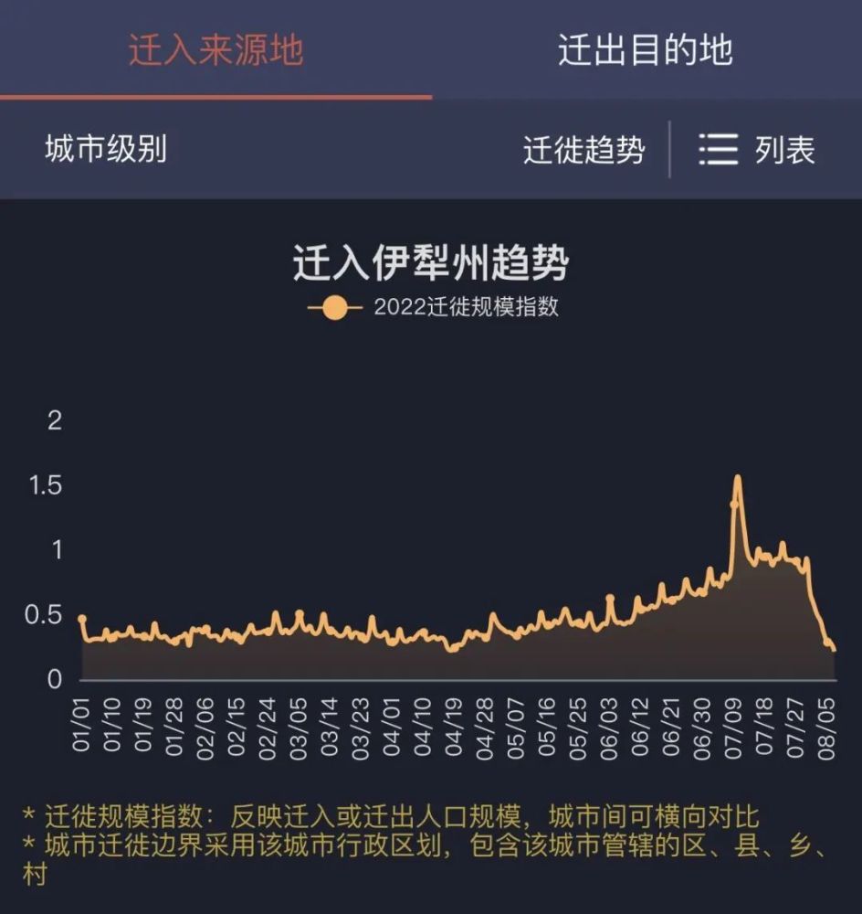百度迁徙平台数据显示,乌鲁木齐、伊犁等地于7月10日前后迎来全年迁入规模指数最高峰。