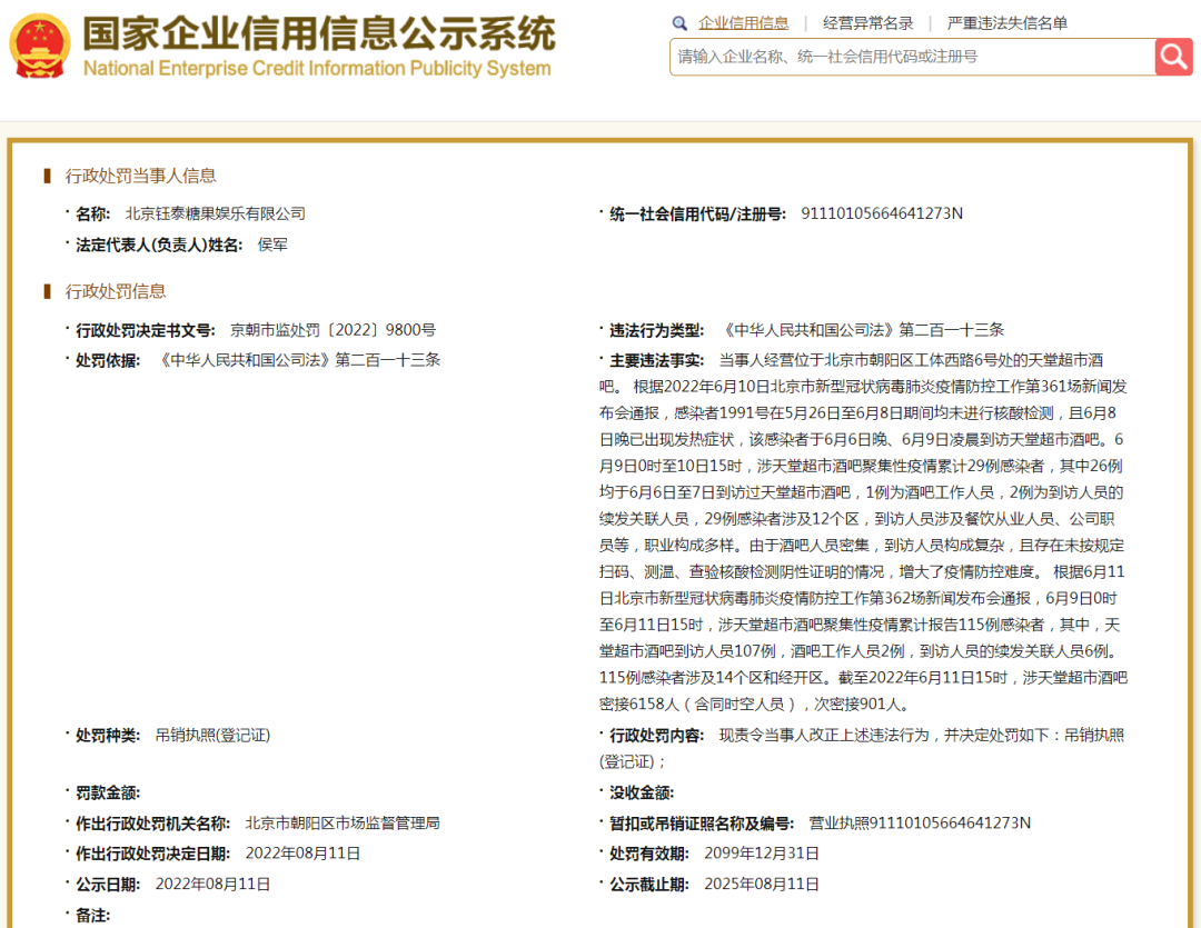 北京市朝阳区市场监管局近日做出行政处罚决定,北京天堂超市酒吧经营者——北京钰泰糖果娱乐有限公司被吊销执照(登记证)。