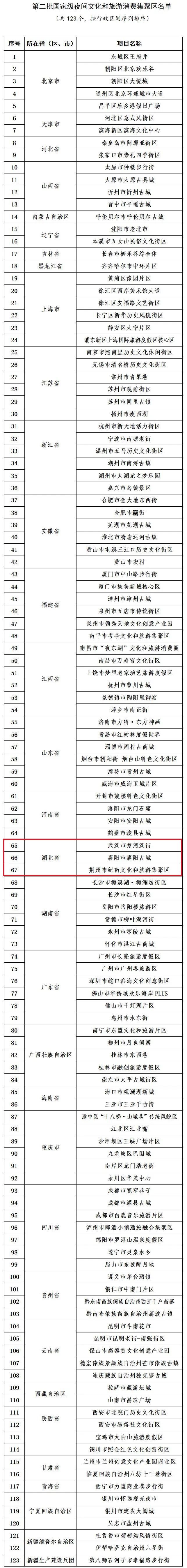 8月25日,文旅之声微信号发布《关于公布第二批国家级夜间文化和旅游消费集聚区名单的通知》,第二批国家级夜间文化和旅游消费集聚区名单出炉,湖北有三地入选,分别是武汉市楚河汉街、襄阳市襄阳古城、荆州市纪南文化和旅游集聚区。