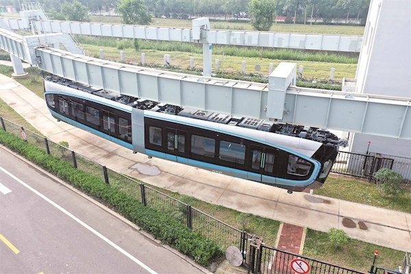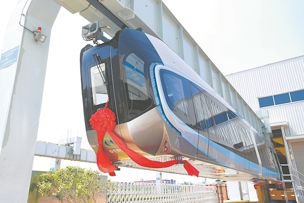 8月26日,武汉光谷空轨旅游线项目首列“光谷光子号”空轨列车在青岛中车四方股份公司成功下线,这是我国首列用于商业运营的空轨列车,开创了我国空轨商用的先河。图为当天列车在厂内调试线上。 通讯员供图