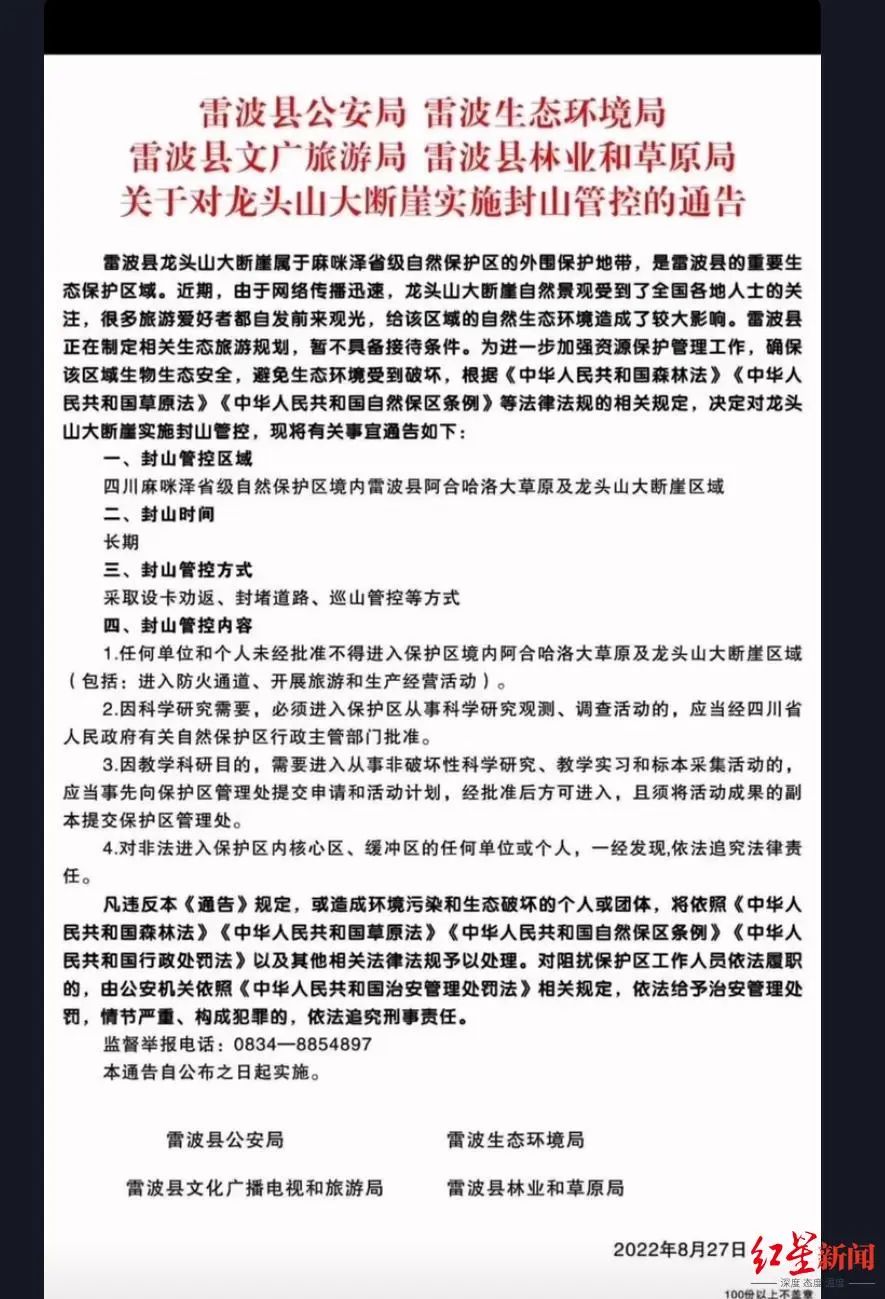 8月28日,红星新闻记者采访了解到,当地相关部门高度重视,及时采取措施。近日,雷波县公安局、雷波县生态环境局、雷波县文广旅游局、雷波县林业和草原局等部门发布关于对龙头山大断崖实施封山管控的通告。