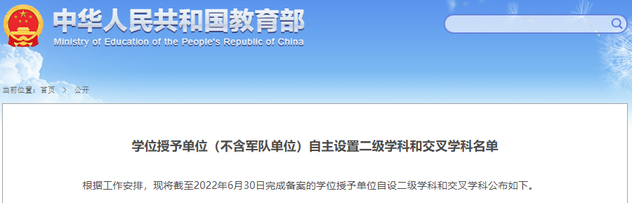 近日,教育部公布了最新的学位授予单位(不含军队单位)自主设置二级学科和交叉学科的名单。