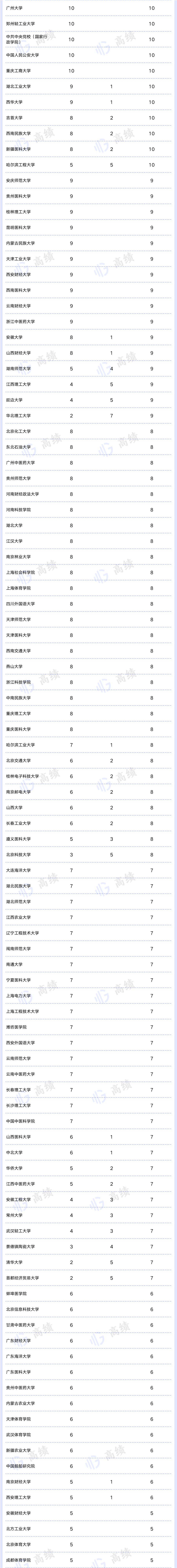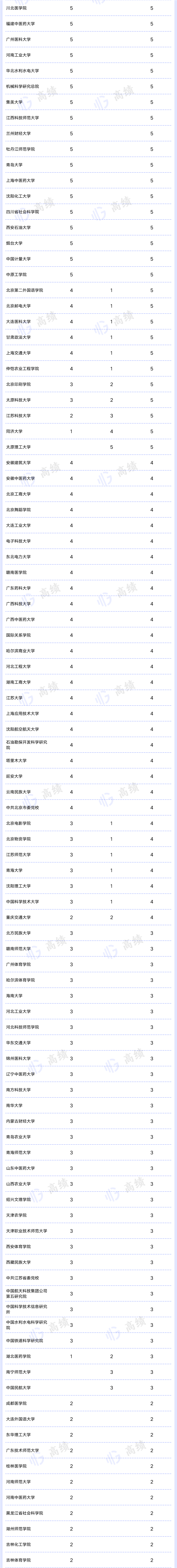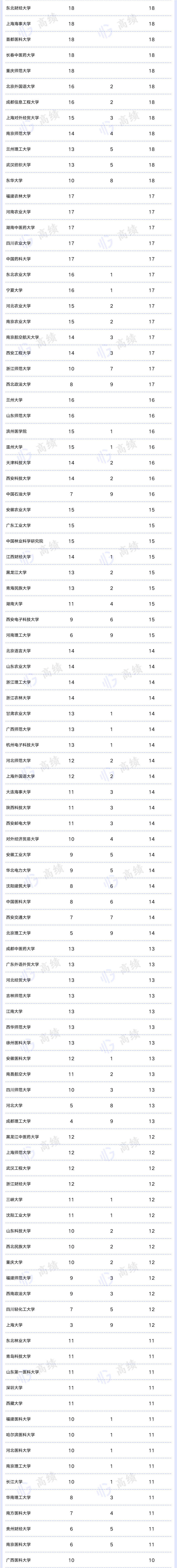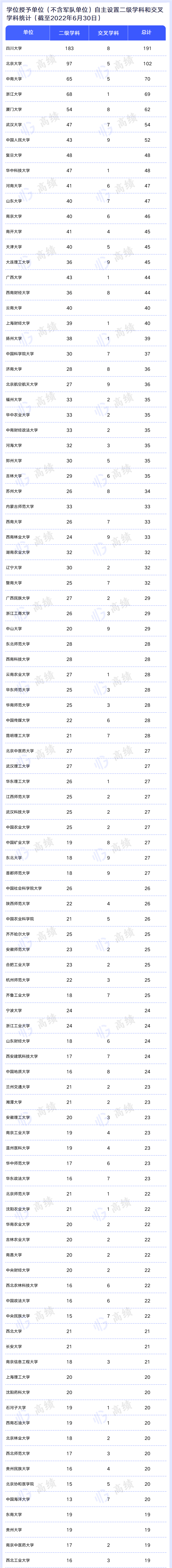 从自主设置的二级学科数来看,四川大学有183个,北京大学有97个,超过50个的还有浙江大学(68个)、中南大学(65个)和厦门大学(54个)。