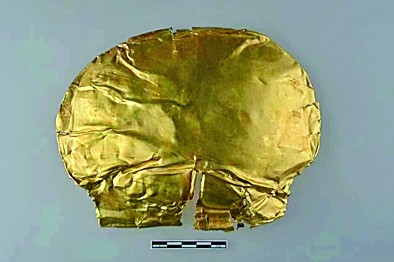 郑州商城遗址高等级贵族墓M2中出土的金覆面 新华社发