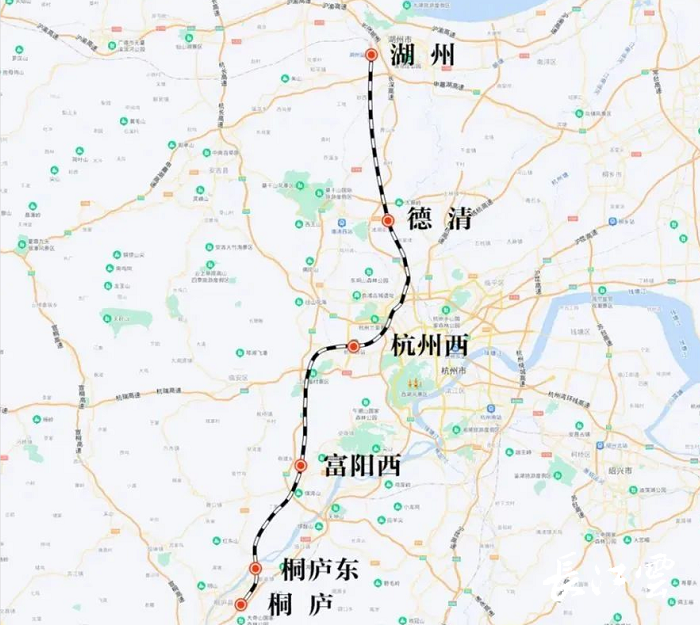 合杭高铁湖杭段是杭州亚运会重要保障项目,线路从既有湖州站引出,经湖州市南太湖新区、吴兴区、德清县,杭州市余杭区、西湖区、富阳区和桐庐县,跨富春江后引入杭黄高铁桐庐站,新建线路长约137.8公里,设计时速350公里,全线设湖州、德清、杭州西、富阳西、桐庐东、桐庐6座车站,其中杭州西、富阳西、桐庐东为新建车站。