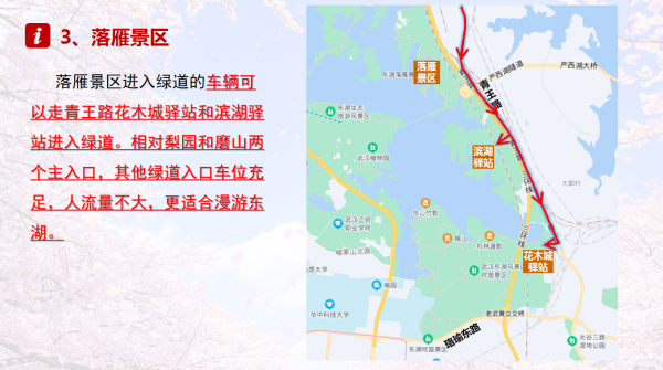 按照到东湖景区游玩的常规路线,二环线东湖渔光小路、鲁磨路植物园路、落雁景区落雁归雁路为三个主要进入绿道的入口。合理地规划出行路线,才不会浪费宝贵时间。