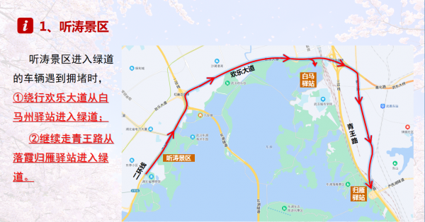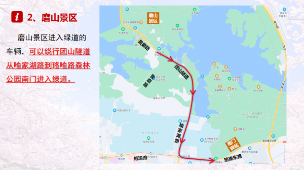 其次,绕行避堵。听涛景区进入绿道的车辆遇到拥堵时,可以绕行欢乐大道从白马州驿站进入绿道,也可以继续走青王路从落霞归雁驿站进入绿道。磨山景区进入绿道的车辆可以绕行团山隧道从喻家湖路到珞喻路森林公园南门进入绿道。落雁景区进入绿道的车辆可以走青王路花木城驿站和滨湖驿站进入绿道。相对梨园和磨山两个主入口,其他绿道入口车位充足,人流量不大,更适合漫游东湖。