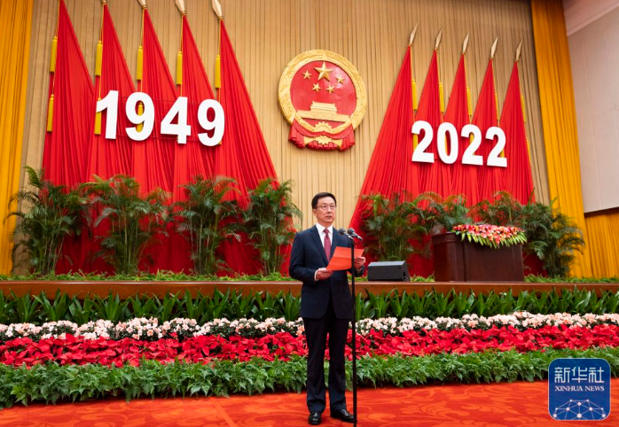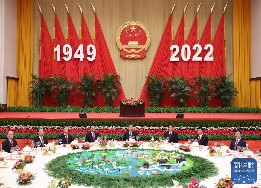 人民大会堂宴会厅华灯璀璨、鲜花绽放,洋溢着喜庆热烈的节日气氛。主席台上方,庄严的国徽高悬,“1949-2022”的大字年号在鲜艳的红旗映衬下格外醒目。