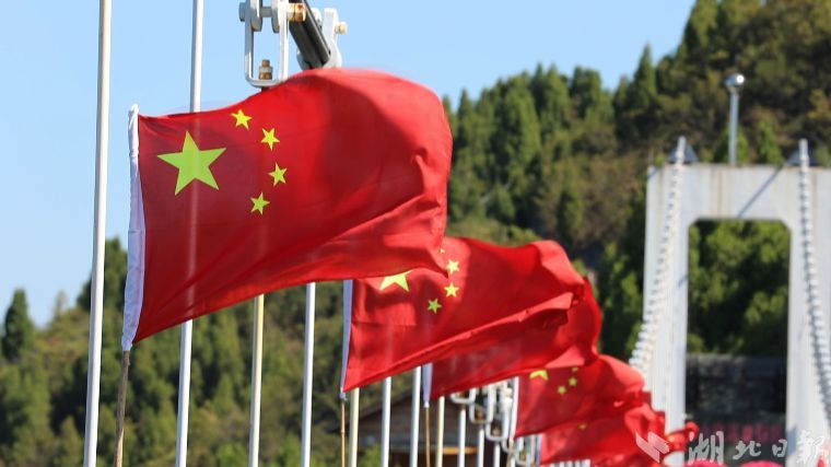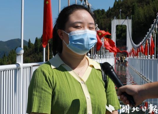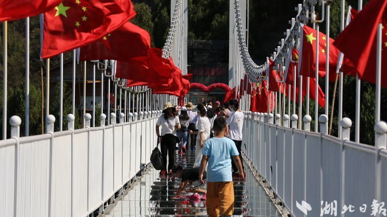 在大畈镇龙隐山景区玻璃栈道上的五星红旗迎风飘扬,十分艳丽。瞬间点燃了现场游客的爱国热情,引来不少游客纷纷前来与国旗合照留念,抒发自己的爱国情怀。