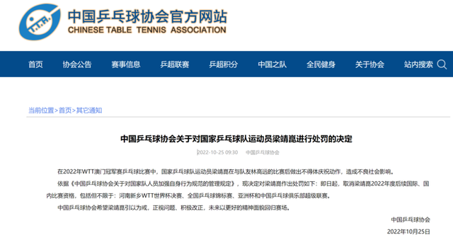 中国乒乓球协会25日上午发布了取消国家队运动员梁靖崑多项比赛资格的处罚通知——