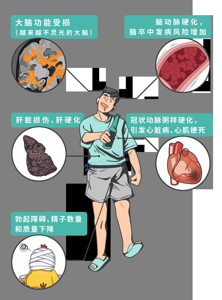很多研究都早已表明,喝酒毁全身!酒精会损害大脑、血管、心脏以及生殖器官等多个组织系统,而且会提高6种癌症的中奖概率,包括咽喉癌、食道癌、肝癌、胃癌、结直肠癌、乳腺癌。