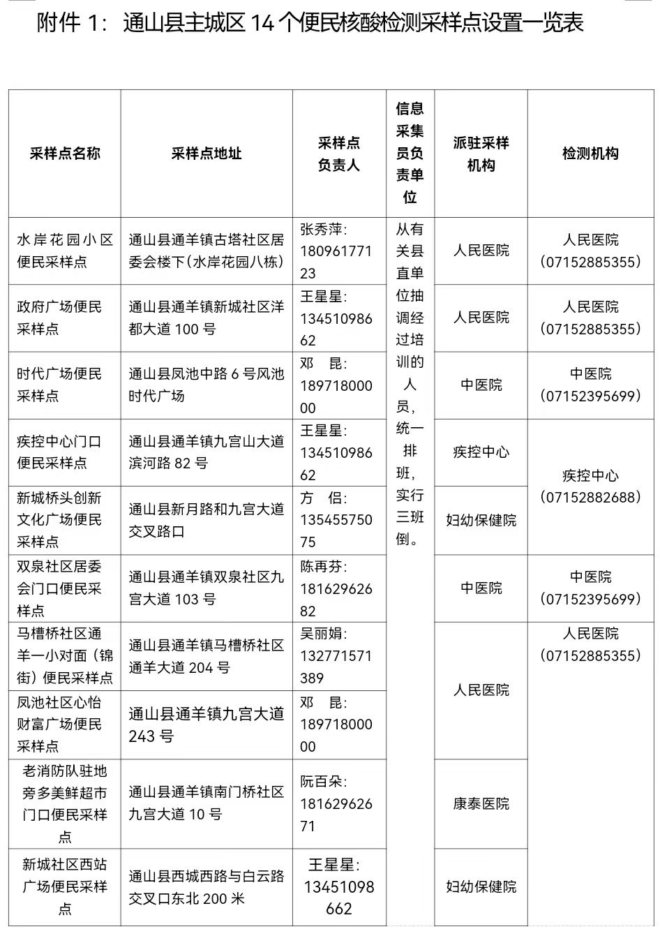 附件:1、通山县主城区14个便民核酸检测采样点设置一览表