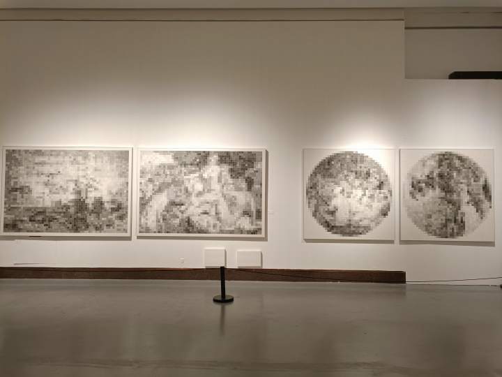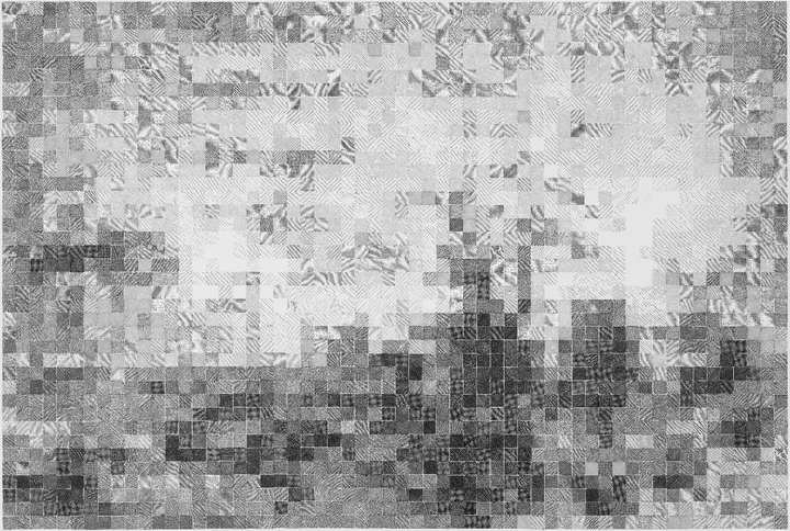 杨宏伟将木板做成方块,并将灰度按1-99刻下来,作为一套“活字”,组合成一幅幅画作。需要远观才易分辩的《像素分析6号》,正如同低精度的数码图像放大到底的效果——马赛克方块的组合。