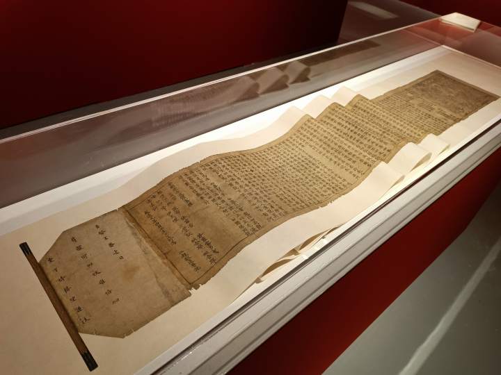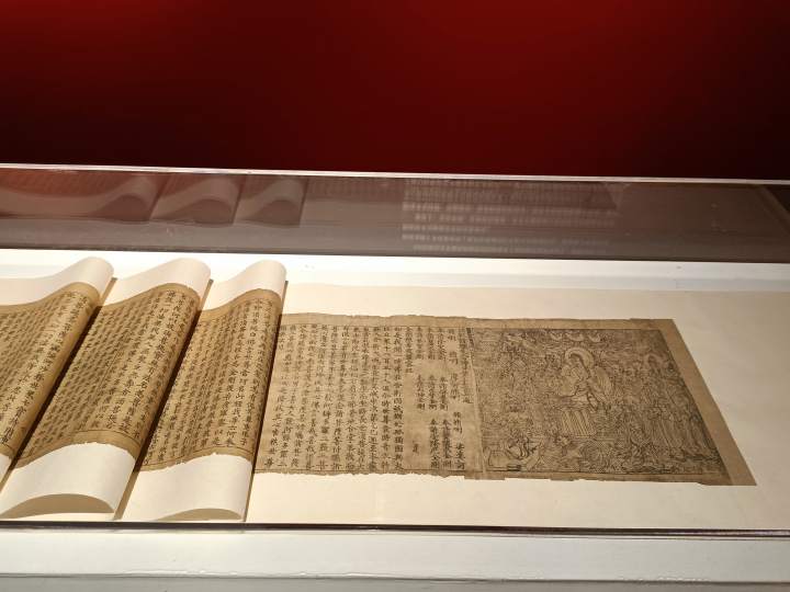 敦煌本《金刚般若波罗蜜经》(复制品),24.4×488cm,唐懿宗咸通九年(公元868年),木版雕印,现藏英国大英博物馆图书馆
