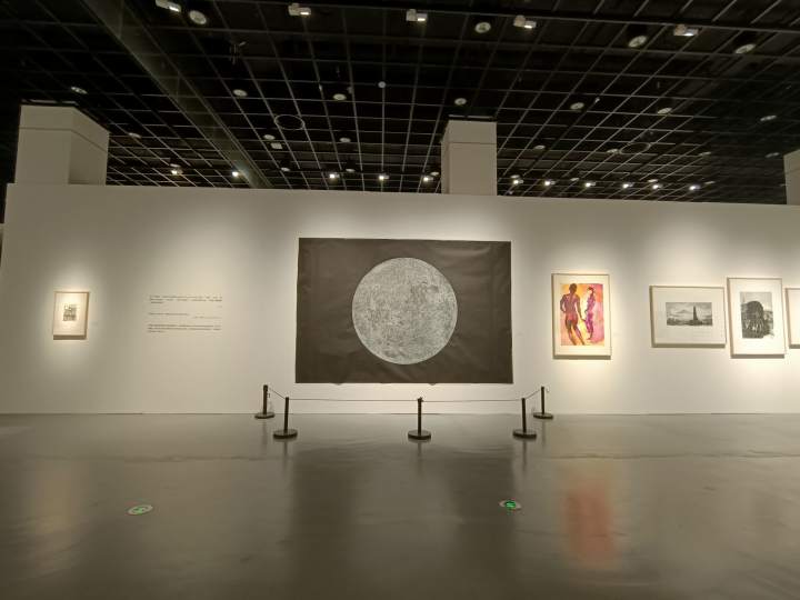 展厅中悬挂着一枚“月亮”,这是德国艺术家奇奇·史密斯的《木月》。不是木星与月球的结合体,而是诞生于木头的月亮——她将木刻技术运用到了自己的创作当中。