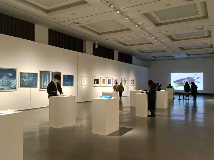 在4号10号展厅当中,我们还可以“触摸”到这些版画艺术。展厅中央展示着38位艺术家的42本艺术家书,我们戴起手套,就可以对这些作品一一细读。