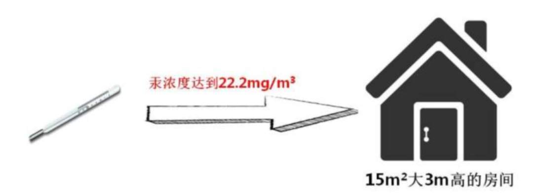 日常使用的一支标准水银体温计约含有1g的汞。如果破碎后汞全部蒸发,可使一间面积15平方米、3米高的房间空气汞浓度达到22.2mg/m³;而我国环境空气质量标准规定,汞蒸汽浓度的安全限值为50ng/m³。所以破碎体温计洒落的汞一定要认真处理,但也不必惊慌,如果能及时收集散落汞株、加上一定时间的开窗通风,是不会对人体造成健康影响的。