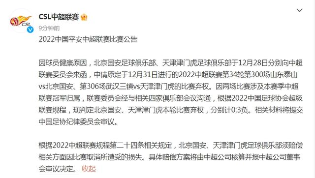 在中超联赛的公告中写道,因球员健康原因,北京国安足球俱乐部、天津津门虎足球俱乐部于12月28日分别向中超联赛委员会发函,申请原定于12月31日进行的2022中超联赛第34轮第300场山东泰山vs北京国安、第306场武汉三镇vs天津津门虎的比赛弃权。