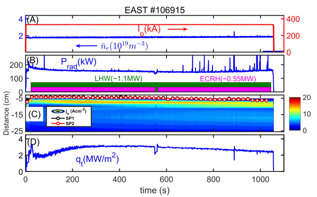 千秒长脉冲放电。0.33MA等离子体电流和平均密度(A),辐射功率和辅助加热功率1.65MW(B),离子饱和电流以及内外靶板打击点SP1和SP2(C),偏滤器热通量峰值(D)。