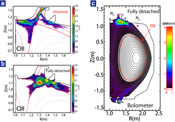 偏滤器全脱靶与着靶状态等离子体辐射的二维分布对比。