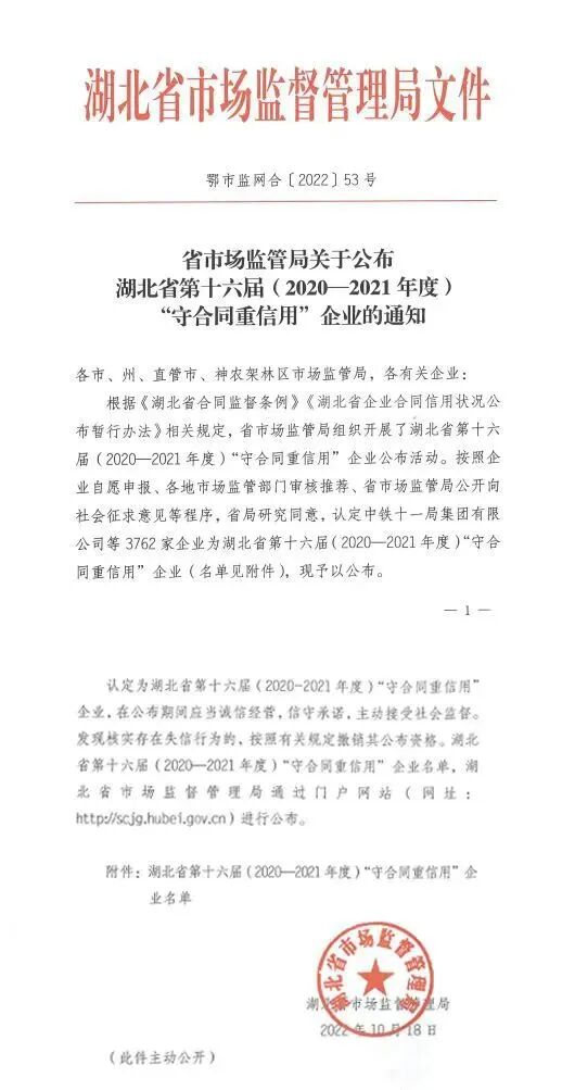 湖北省“守合同重信用”企业评选活动是湖北省市场监管局核准的一项高规格评选工作,旨在进一步发挥信用监管的基础性作用,推进企业信用体系建设。目前已开展到第十六届(2020-2021年度)。