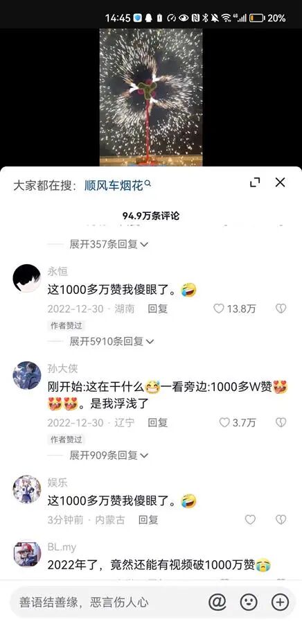 许多网友感叹:不知道咋了,看个烟花都感动;一早上刷到这么漂亮的“顺风车”烟花,希望2023年顺顺利利,家人平安健康、快乐幸福,也祝国家顺风顺水,国泰民安;第一次看到上千万赞的视频;这1000多万赞我傻眼了……